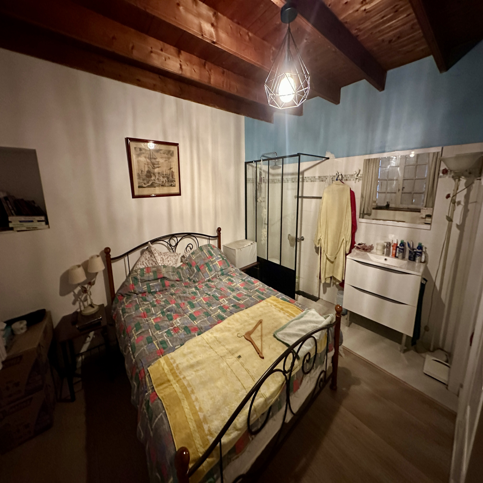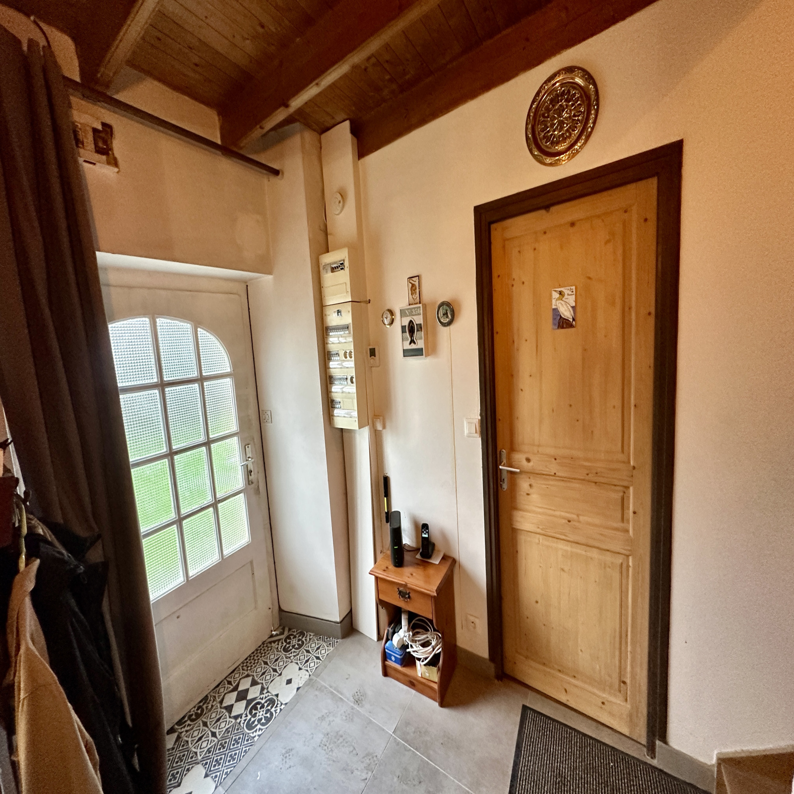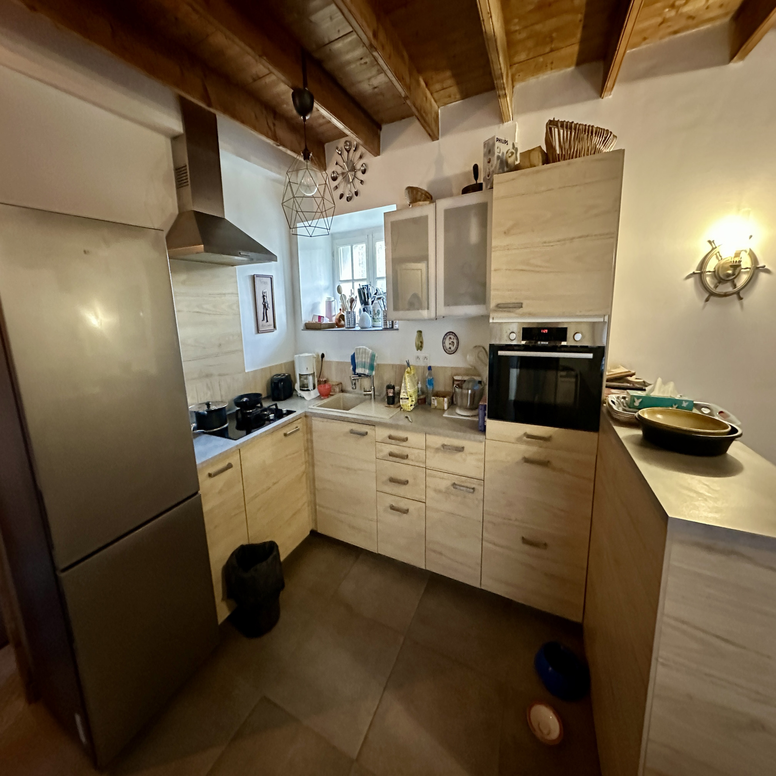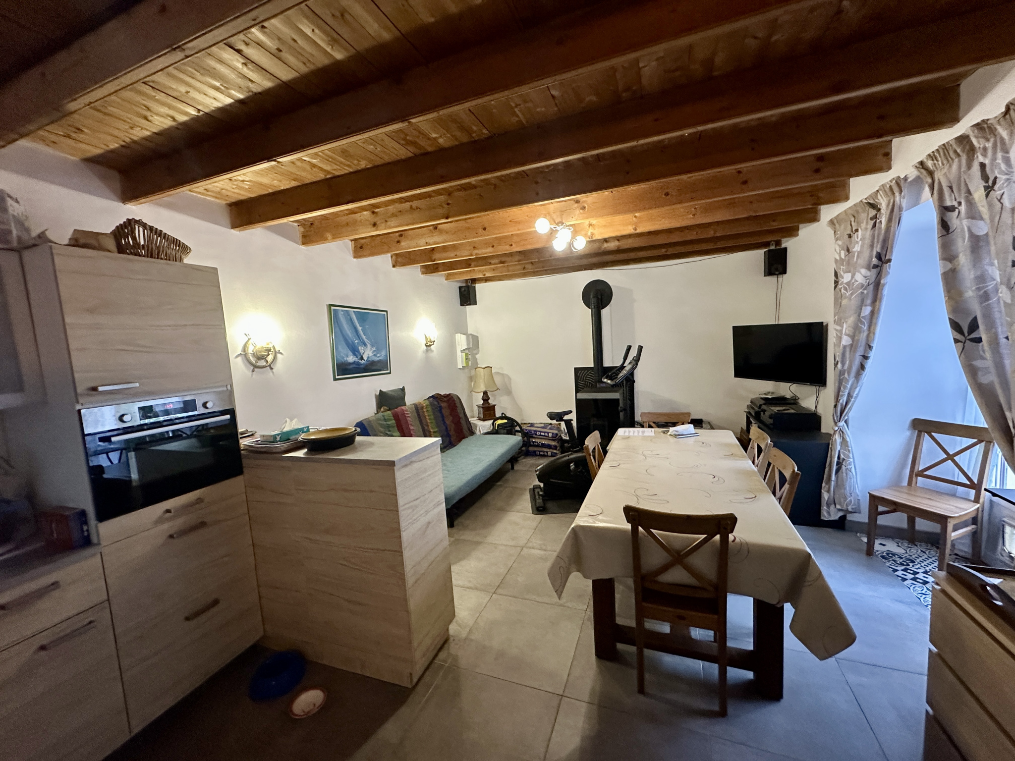 - Au RDC : une entrée, une cuisine aménagée et équipée donnant sur le séjour / salon avec un poêle à granules, une chambre avec une douche et un point d'eau, un WC indépendant ;