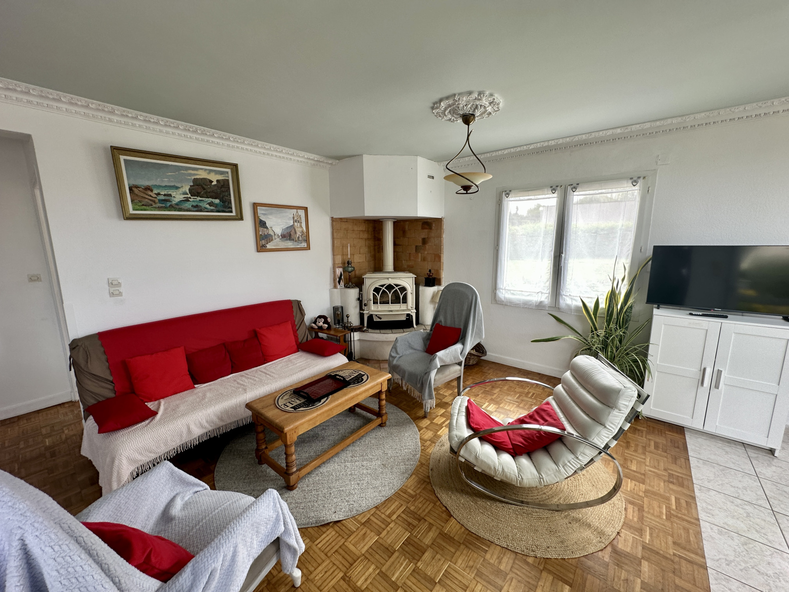 Une entrée dessert, une spacieuse pièce de vie baignée de lumière, agrémentée d’un poêle à bois, idéale pour des moments chaleureux en famille.