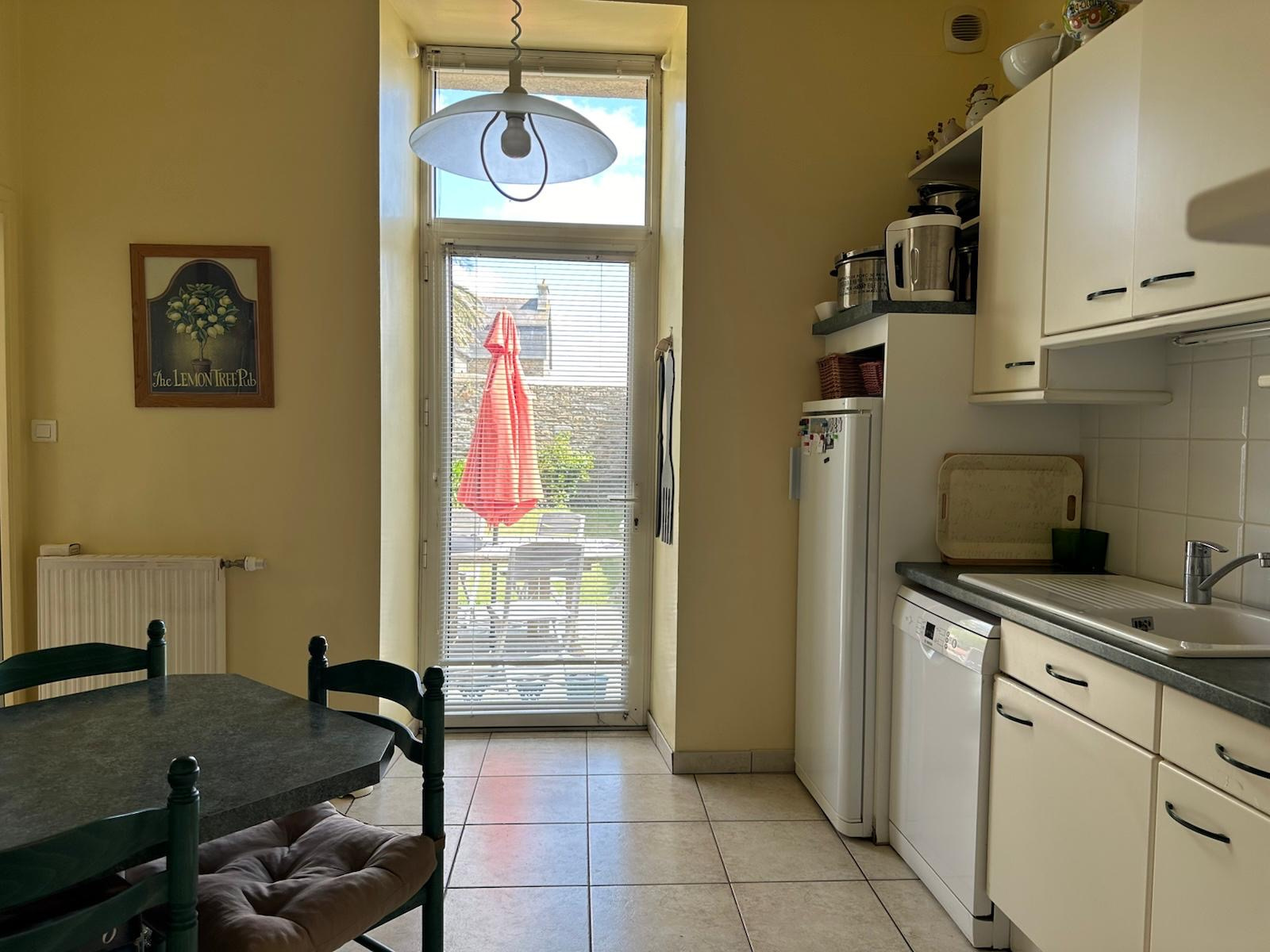 L'entrée dessert un agréable séjour/salon lumineux, une cuisine aménagée indépendante, ces pièces donnant directement accès sur le jardin clos. Vous y trouverez également un bureau ainsi qu'un WC.