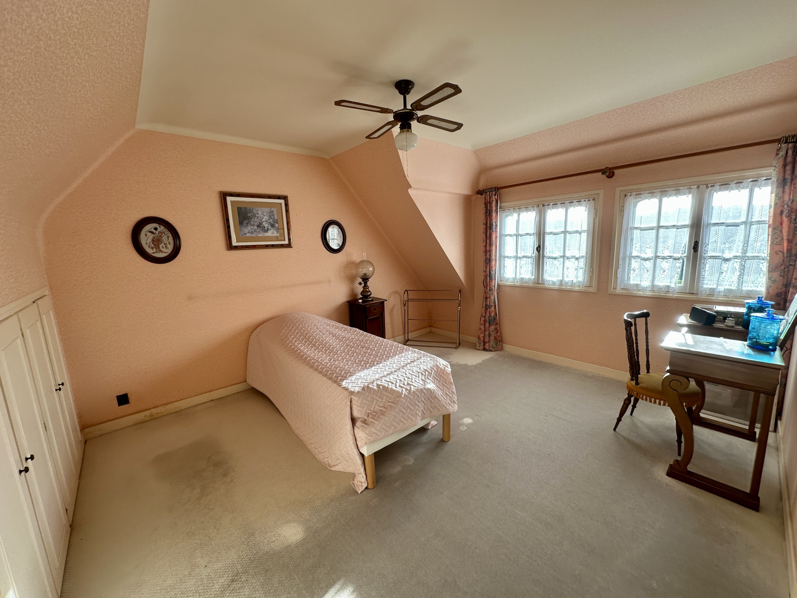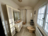 À l’étage, un palier mène à 2 chambres, dont l’une dispose d’un espace toilettes, ainsi qu’à une salle d’eau avec WC.