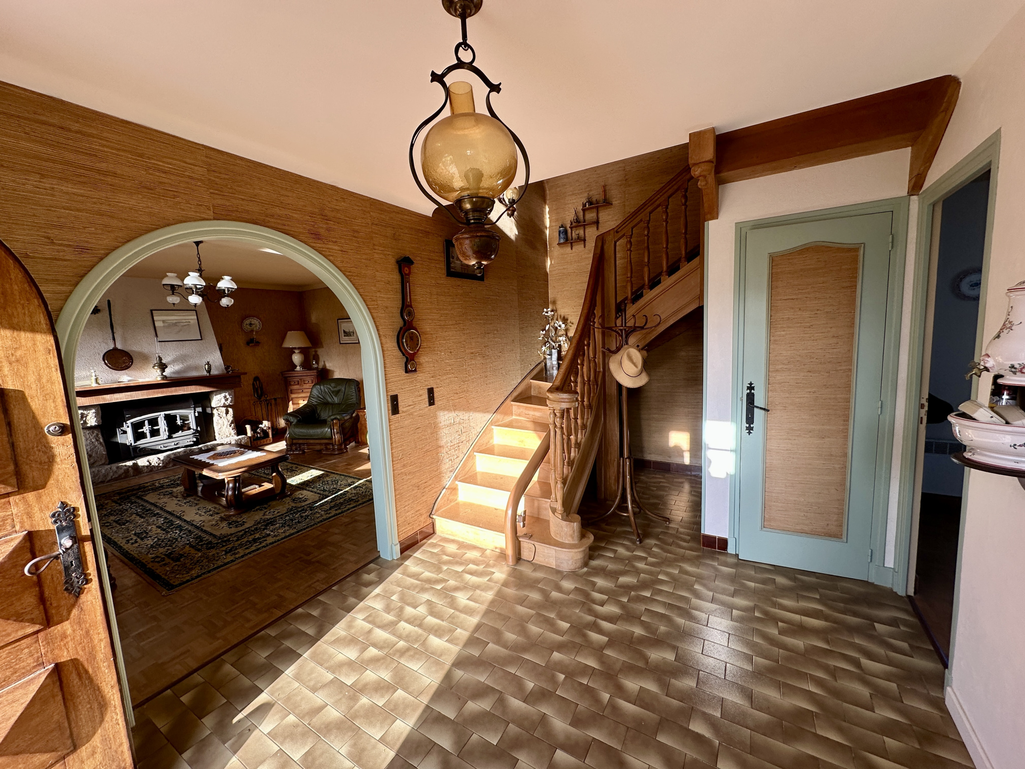 La maison principale s’ouvre au rez-de-chaussée sur une entrée desservant un séjour chaleureux, une cuisine indépendante, une chambre et des toilettes.